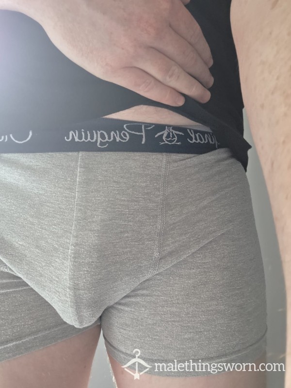 Grey worn Penguin Boxers. Message me for addons / requests!