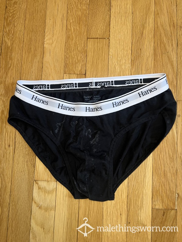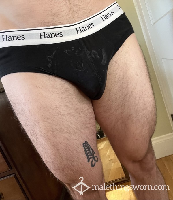 Medium well worn jock that’s turning yellow inside and out with crusty c*m stains....