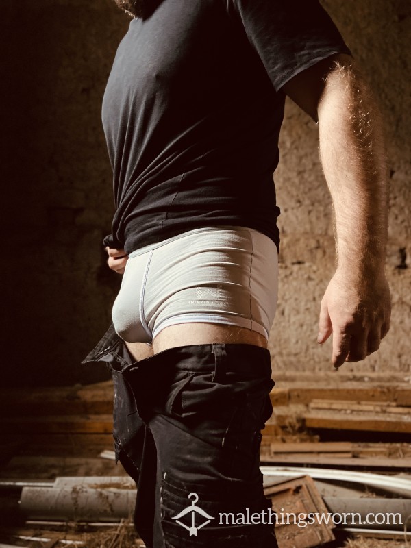 These labeless white briefs had sure taken a beating from my sweaty crack and balls, soaking up all...