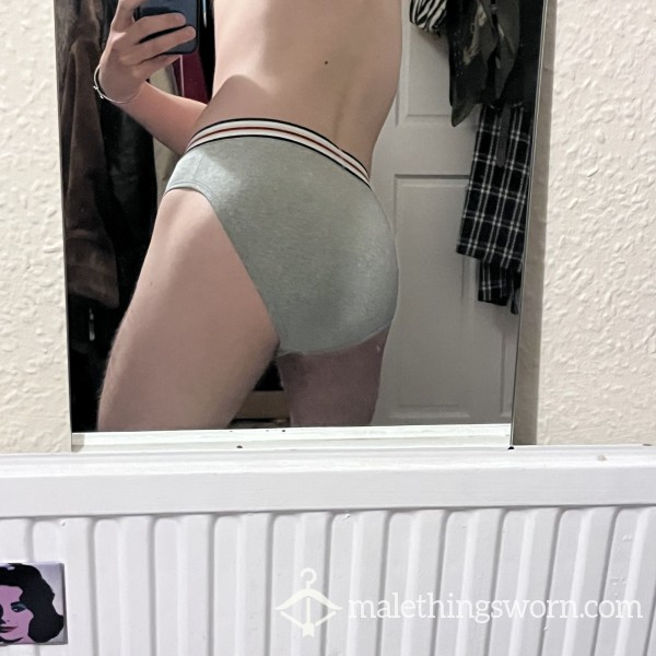 A pair of my size medium grey briefs, they've served me well, a favourite for the gym let me know if you have any questions or requests