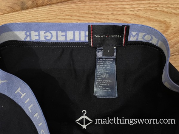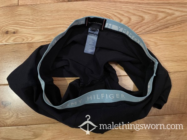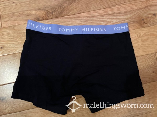 Men's Tommy Hilfiger black tight fitting Boxer Shorts (S), with Aqua waistband. These ones really show up the stains! I can wear them all day and night and during workouts and playtime and they get sweaty and man scented. Will wear them for 2 days and nights straight or longer if you want, may even have a little pre-c*m in them. If you want I can c*m in them if you want for a little extra. Just message me with requests. Free UK postage. International postage is extra.